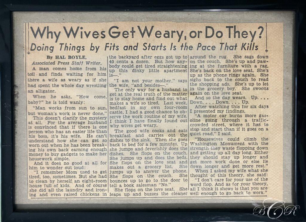 I bought a used book at the library, a number of years ago, and found this funny newspaper clipping tucked inside about wives and housekeeping. I loved the title and story and had to frame it for my office. You can read the article in the picture if you’d like, but the heading read this way: